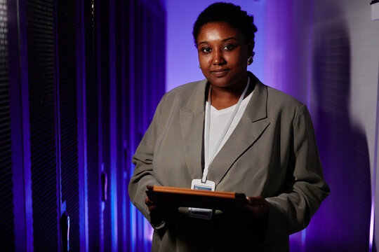 Waist up portrait of African American young woman inspecting data network in server room lit by neon light and looking at camera, copy space