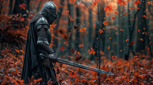 Fantasy image of medieval knight with sword in the autumn forest.