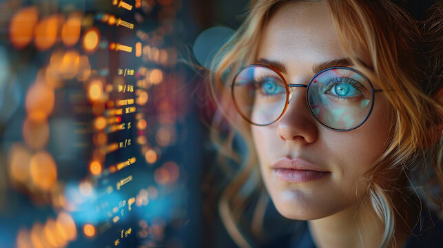 A woman is looking at a computer screen with a lot of numbers and lines. She is wearing glasses and she is focused on the screen