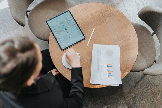 Adult Asian female executive presents business data charts graphs digital tablet pen corporate meeting office setting explaining financial report insights market analysis strategic planning