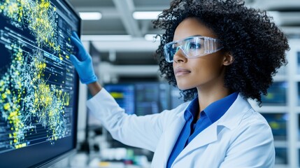 Focused female scientist in lab coat examines complex data on a large computer screen. She wears safety glasses and gloves, intently studying the yellow and blue digital display.