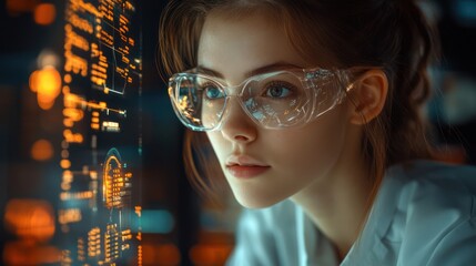 Futuristic technology vision: A woman with glasses displaying digital information
