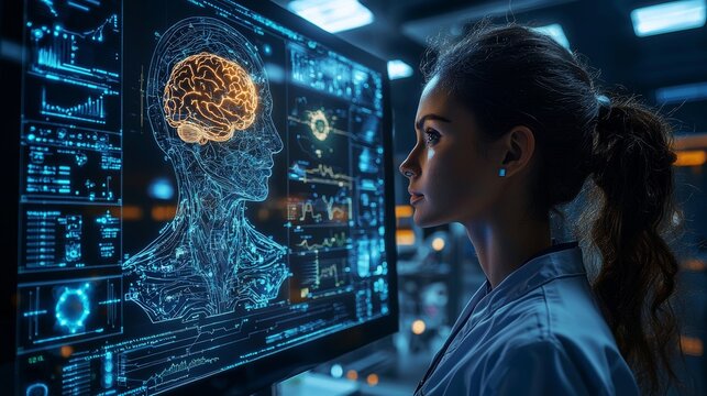 A female scientist studies a digital representation of an illuminated brain, signifying advanced cognitive research and neurological scientific innovation.