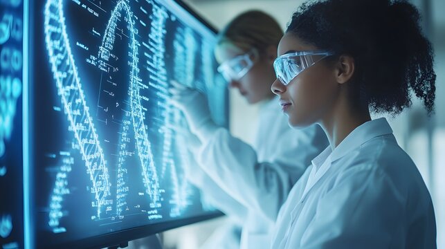 A scientist in a modern laboratory analyzing a digital representation of a DNA strand. The image symbolizes scientific research, innovation, and the exploration of genetic codes.