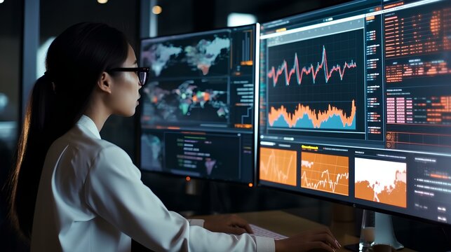 A female data scientist extracting insights from big data analysis. Her screen is filled with large data sets and graphs. generative AI