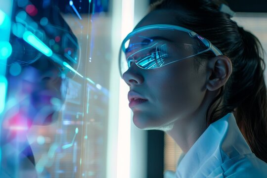 Female Scientist Analyzing Lab Data With Augmented Reality Interface Images