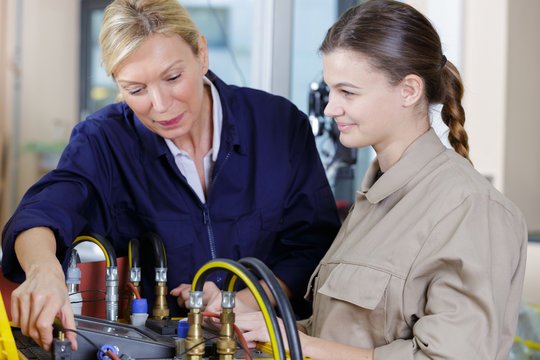 Genuine services. African american woman, professional female mechanic repairing car engine, tighten, screw with spanner while her colleague holding torch under car hood at service station