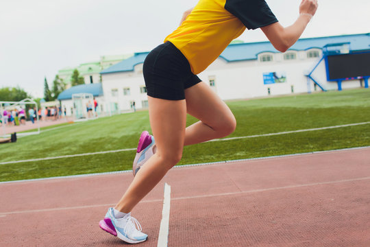 Close-up of female athlete in running shoes on starting block at running track. Concept of speed and competition