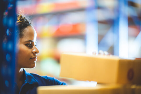 Female Warehouse Worker Smiling While Packaging Boxes Images