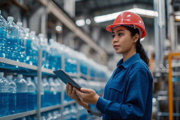 Focused Asian female worker uses tablet to monitor quality control in bottled water manufacturing plant.