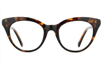 A stylish pair of tortoise-shell pattern cat-eye eyeglasses against a plain white background, showcasing a fashionable and modern design.