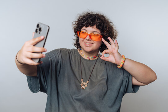 A person with curly hair wearing orange sunglasses takes a selfie, making an OK gesture with their hand. They are wearing a gray t-shirt and colorful accessories against a plain background.