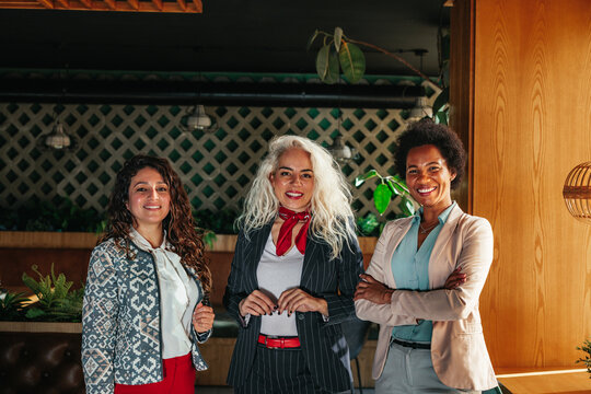Portrait of cheerful mixed age range multi ethnic women celebrating International Women's Day