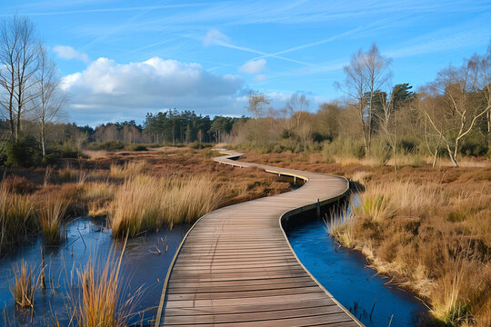 A sun-dappled fen with reflective pools, providing a habitat for unique plant species and wildlife. Concept of diverse fen ecosystems. Generative Ai.