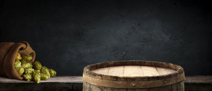 Oktoberfest beer barrel and beer glasses with wheat and hops on wooden table