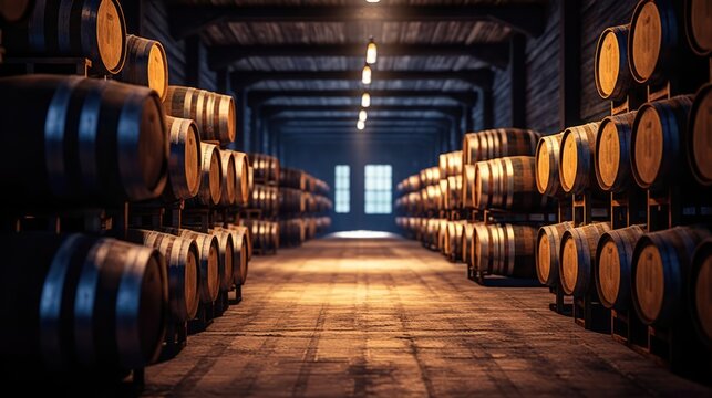 Wine Production: Stainless Steel Fermentation Tanks and Oak Barrels in a Modern Winery Facility