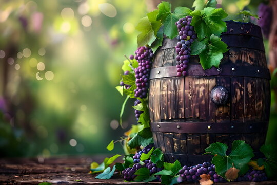 Old wooden barrel with fresh grapes in vineyard, autumn wine harvest concept. Banner with copy space