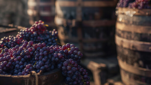 wine bottle and glass in a rustic cellar with grapes and barrel