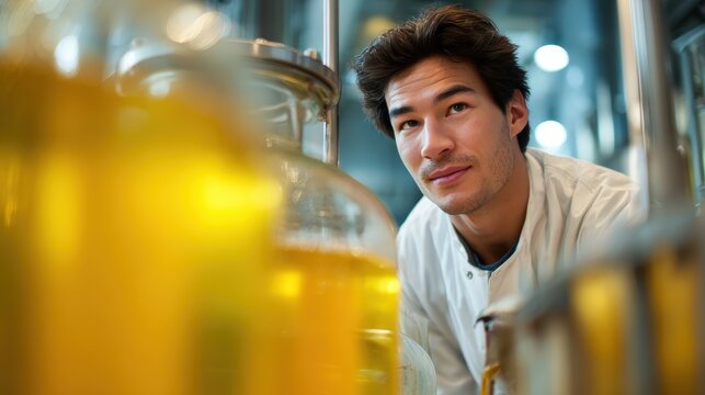 Brewer pouring beer into hydrometer cylinder for quality testing