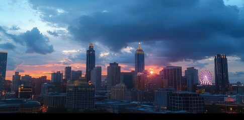 City skyline at sunset with tall buildings and a Ferris wheel under a dramatic cloudy sky