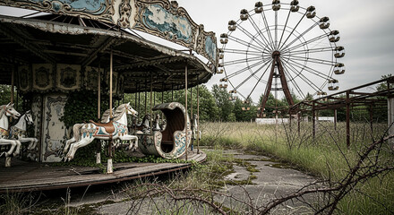 Abandoned Vintage Carousel and Ferris Wheel in Overgrown Amusement Park