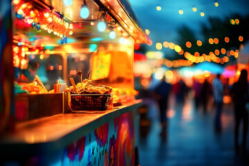 Vibrant food truck attracts crowds at an open-air festival filled with colorful lights and festive energy