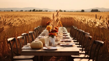 Autumn outdoor long banquet table setting wheat field fall harvest season wide rustic fete party outside dining tablescape