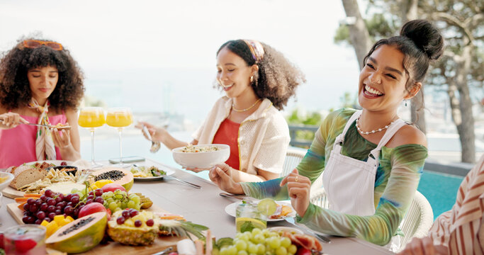 Happy people, laughing and eating with food at resort for lunch, meal or get together by dining table. Group, hungry friends or event with smile or hospitality for feast, holiday party or fun weekend