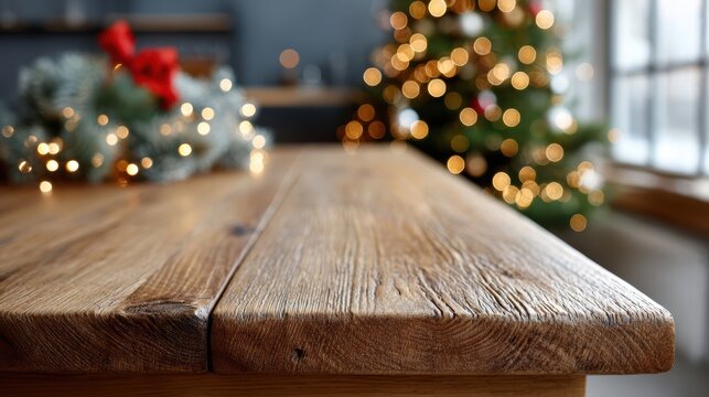 Cozy Christmas Table Close Up Rustic Wood Surface With A Warm, Festive Background Featuring A Blurred Wreath, Bow, And String Lights, Evoking A Cozy Holiday Ambiance