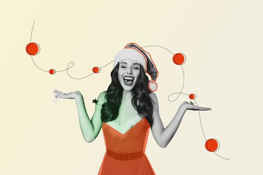Creative trend artwork design collage sketch of young woman attractive happy smile wear santa hat joy festive mood celebration christmas