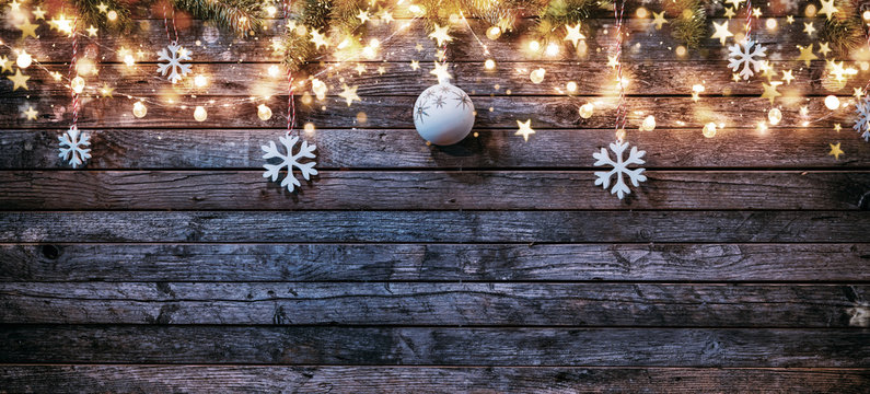 Rustic wooden background featuring a wintry scene with falling snowflakes and christmas trees