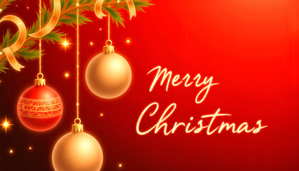 Merry christmas greeting with green fir branches, red ornaments and snow on a festive red background