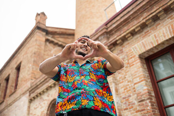 Happy Man in Colorful Shirt Making a Heart Gesture Outdoors