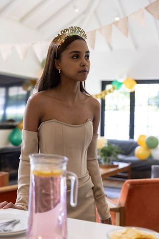 Teenage girl celebrating birthday at home with festive decor