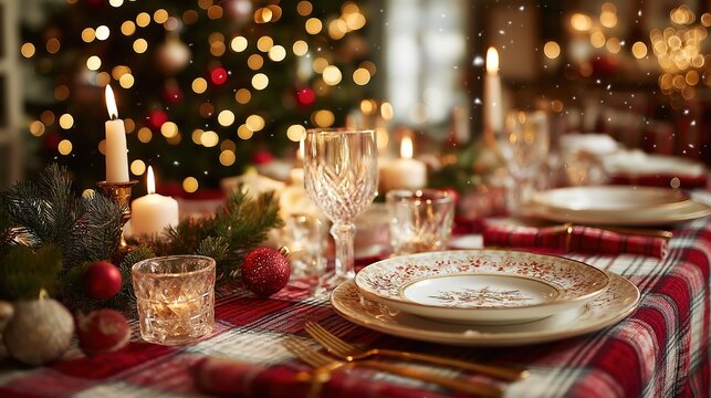 Festive Christmas dinner setup with plaid tablecloth, ceramic plates, silverware, candles, decorated tree, snowflakes, holiday decor, cozy atmosphere, family gathering, luxury dining