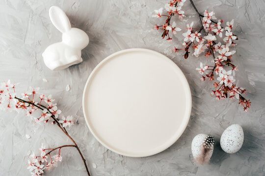 Empty white plate with ceramic bunny, speckled eggs and cherry blossoms on grey background. Easter concept. Top view, flat lay, mockup