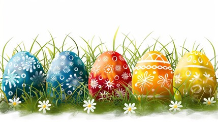 Colorful easter eggs in lush spring grass with cute bunny graphics