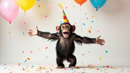 A jubilant young chimpanzee, wearing a festive party hat, joyfully embraces the colorful confetti and balloons surrounding it, a perfect depiction of primate celebration