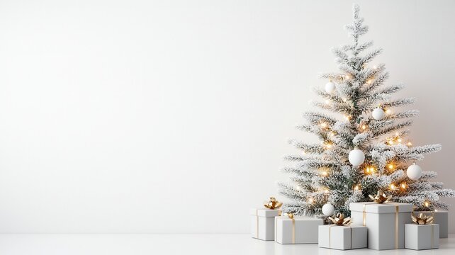 Flocked christmas tree with white ornaments and golden lights, gifts copy branches with under space