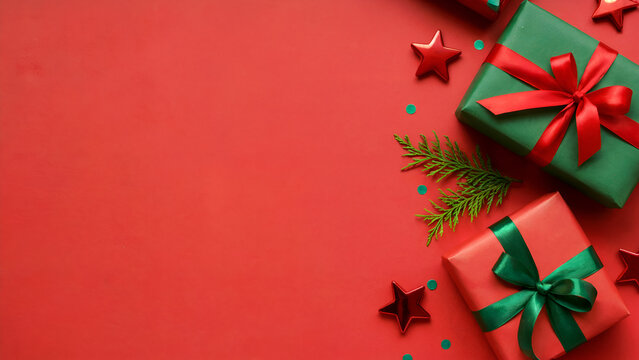 Christmas Gift Flat Lay with Red and Green Presents, Stars and Evergreen Branches on Red Background