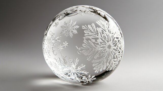 A crystal-clear glass ornament with floating snowflakes inside, accented by frosty patterns on the outer surface, isolated on a silver background