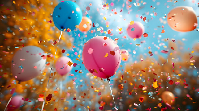 Celebrating with Balloons and Confetti Floating in the Sky Outdoors