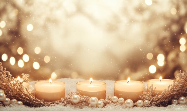 Four lit candles standing in a bed of snow, adorned with festive glittery branches and pearls, with warm bokeh lights