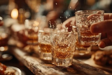 Friends enjoy nightlife in festival atmosphere with beer mugs