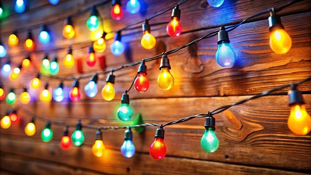 Bright and colorful Christmas string lights hanging against a rustic wooden background. Perfect for festive decor, holiday celebrations, and winter-themed designs...