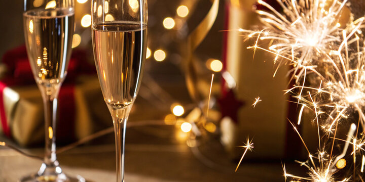a festive banner featuring champagne glasses clinking against an abstract background of sparkling lights, creating a magical atmosphere for celebration and a new year's eve greeting card Generative AI