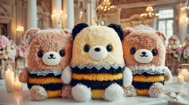 Adorable plush toy figures in bee outfits arranged on elegant tables for festive events