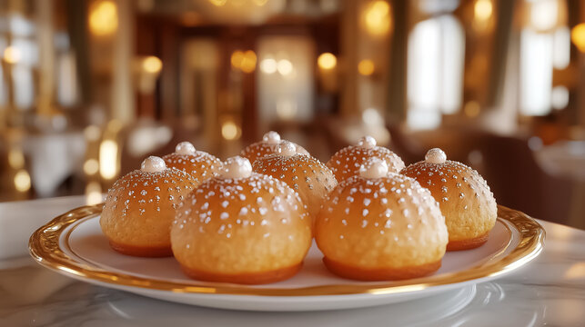 Elegant gourmet pastries decorated with pearls, perfect for weddings and festive celebrations.