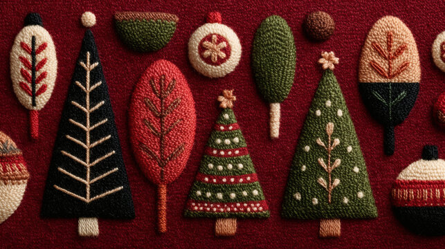 Christmas tree doodles and ornaments arranged in seamless pattern on red background winter texture --ar 16:9 --s 750 --c 20