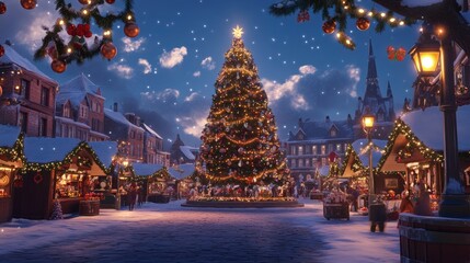 "A quaint village square with a large Christmas tree in the center, adorned with bright ornaments and lights. Festive market stalls line the square, decorated with garlands and ribbons."